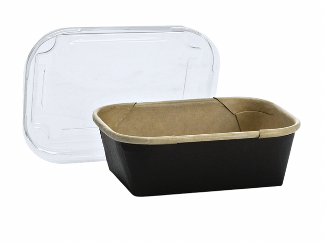 Sustainable sauce/salad containers, ideal for sauces, tapenades, salads, or small snacks. These containers are made of attractive black cardboard with a kraft paper lining. Thanks to the unique folding method, no glue is used in the production of these containers, and the bases are leak-proof. The sauce cups are easy to close with attractive clear PET lids.